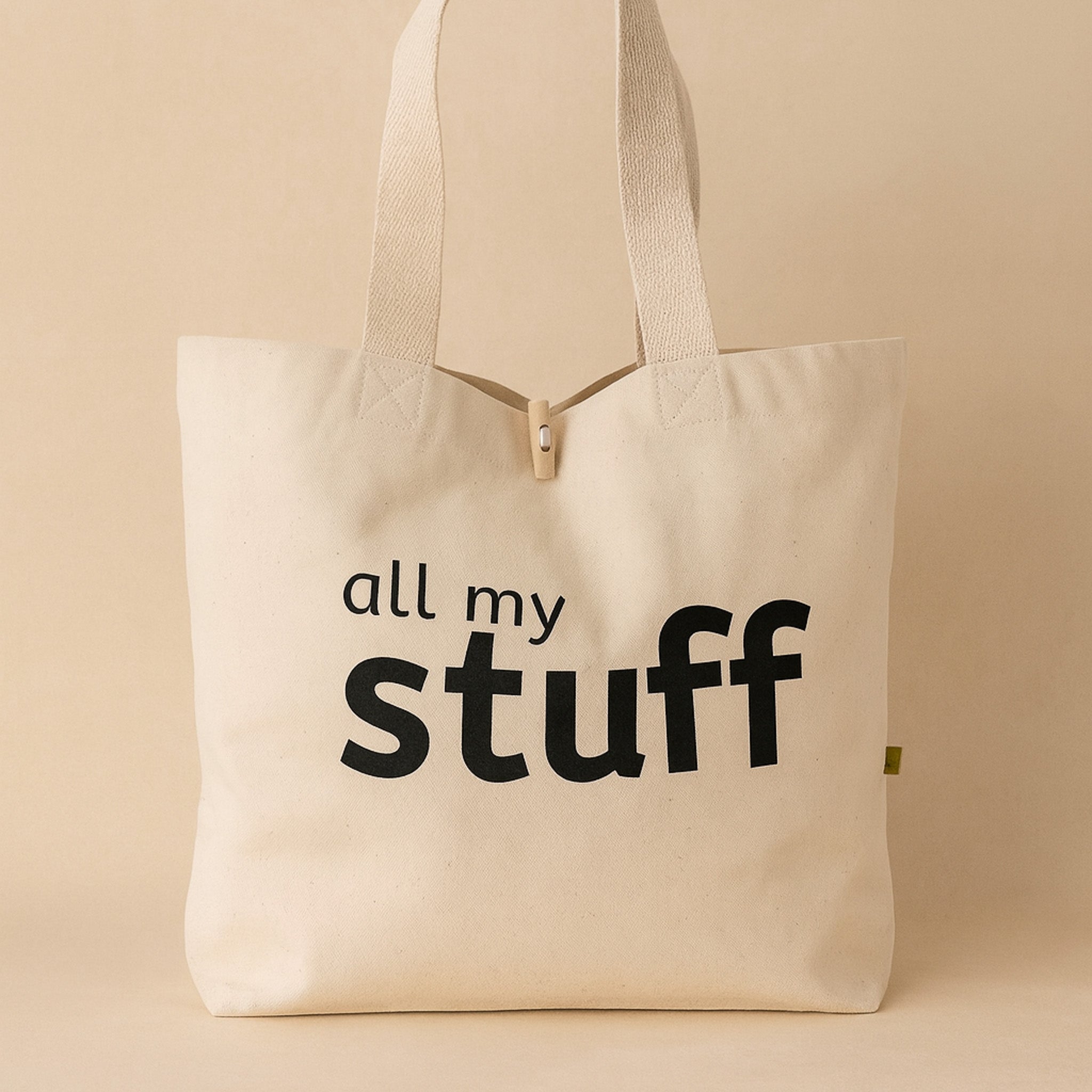 Natural tote bag with 'all my mini stuff' text on a beige background